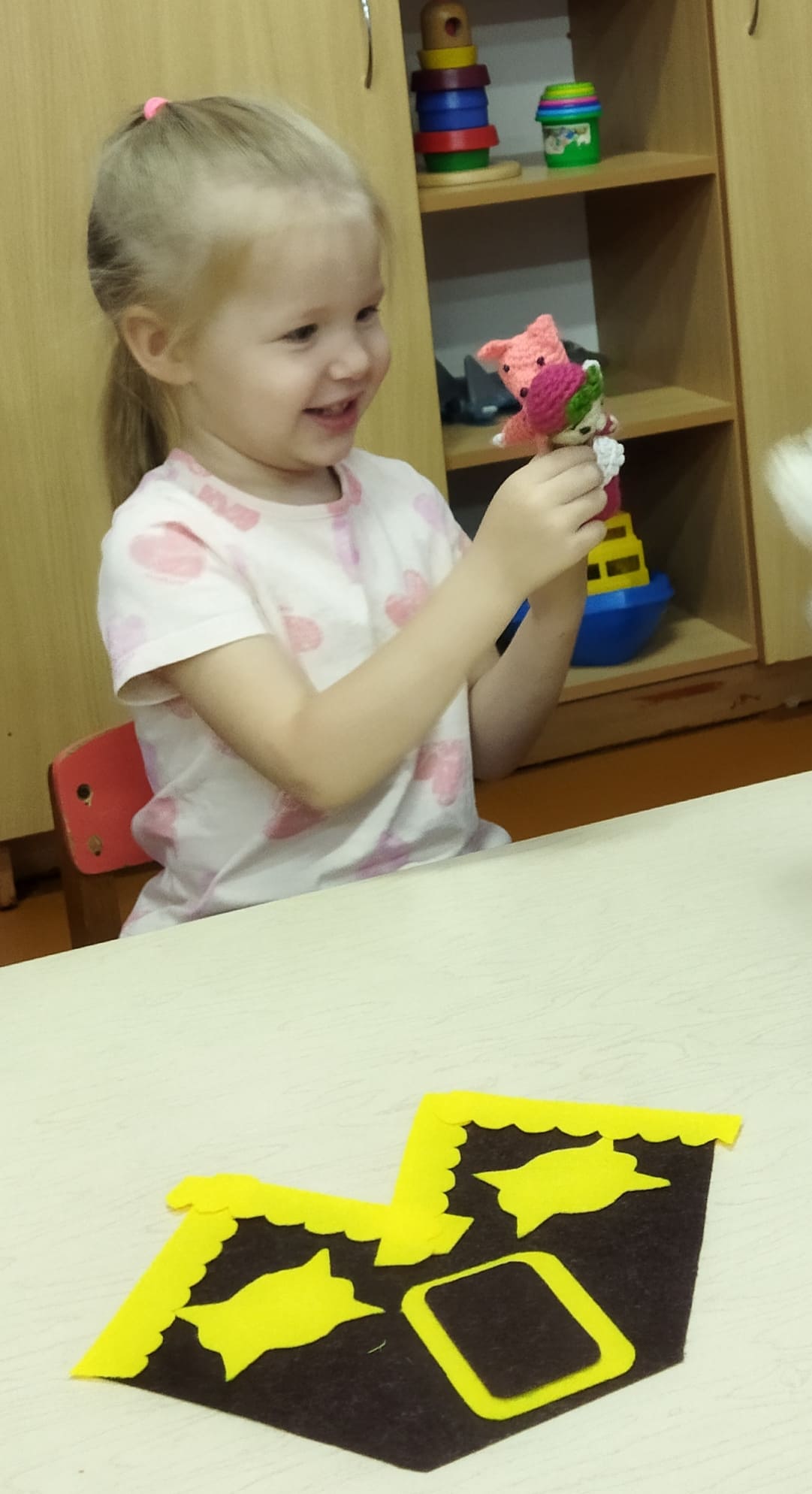Театрализованная деятельность - любимый вид детского творчества. Участвуя в театрализованной деятельности дети дошкольного возраста знакомятся окружающим миром во всем его многообразии. Воспитанники первой младшей группы очень любят пальчиковый театр. С его помощью дети окунаются в удивительный мир сказок, который можно по своему желанию создавать и переделывать. Проговаривая роли персонажей, дети используют разную интонацию и тембр голоса, что способствует развитию речи воспитанников.