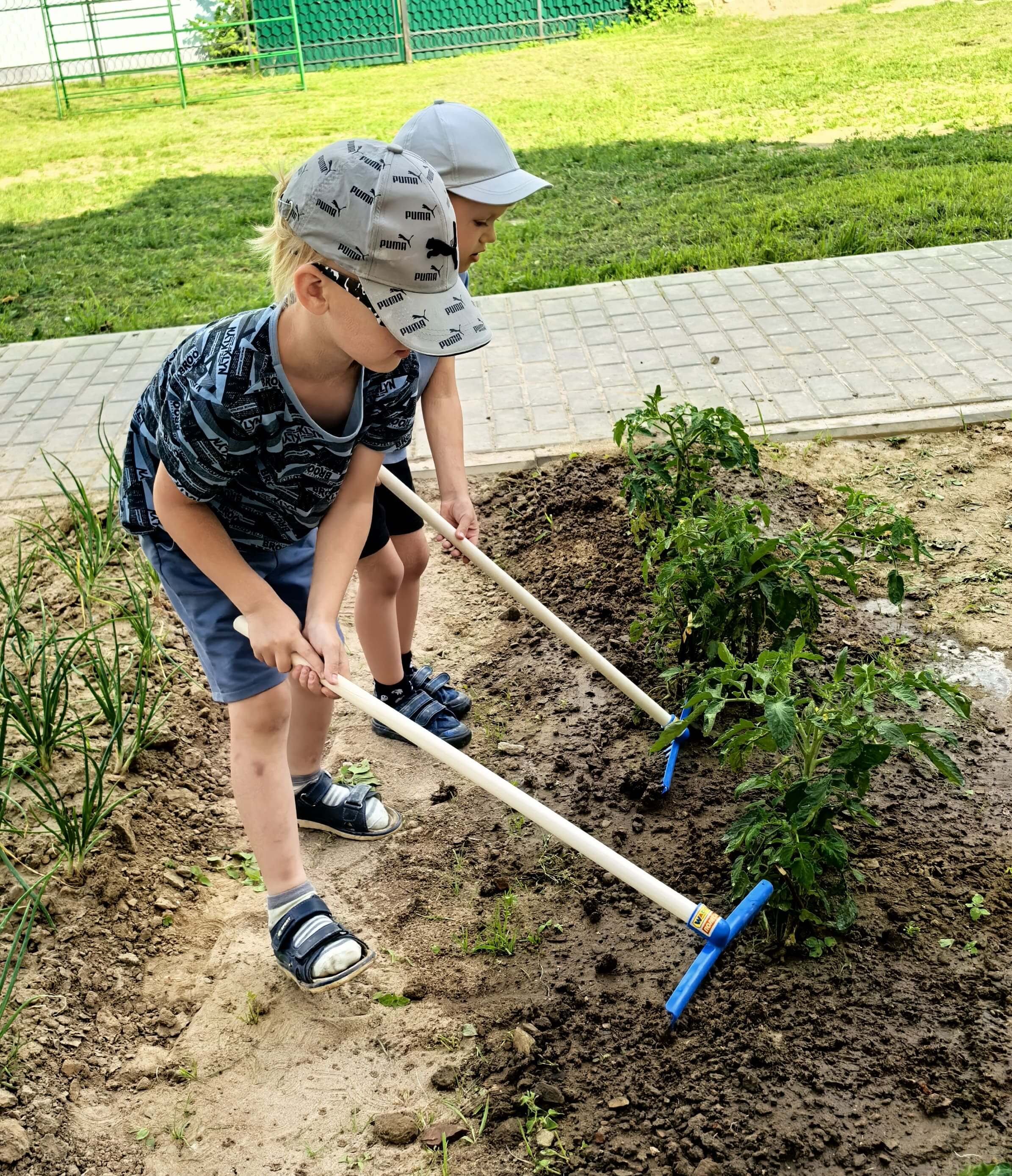 Одним из видов трудовой деятельности в летний период, доступной ребенку дошкольного возраста, является труд в природе. Организованная педагогическим работником трудовая деятельность в огороде позволяет знакомить детей с выращиванием растений и правилами ухода за ними; последовательностью их развития, в процессе выполнения трудовых поручений воспитанники овладевают рядом практических навыков. Дети средней группы охотно поливали томаты и рыхлили землю.