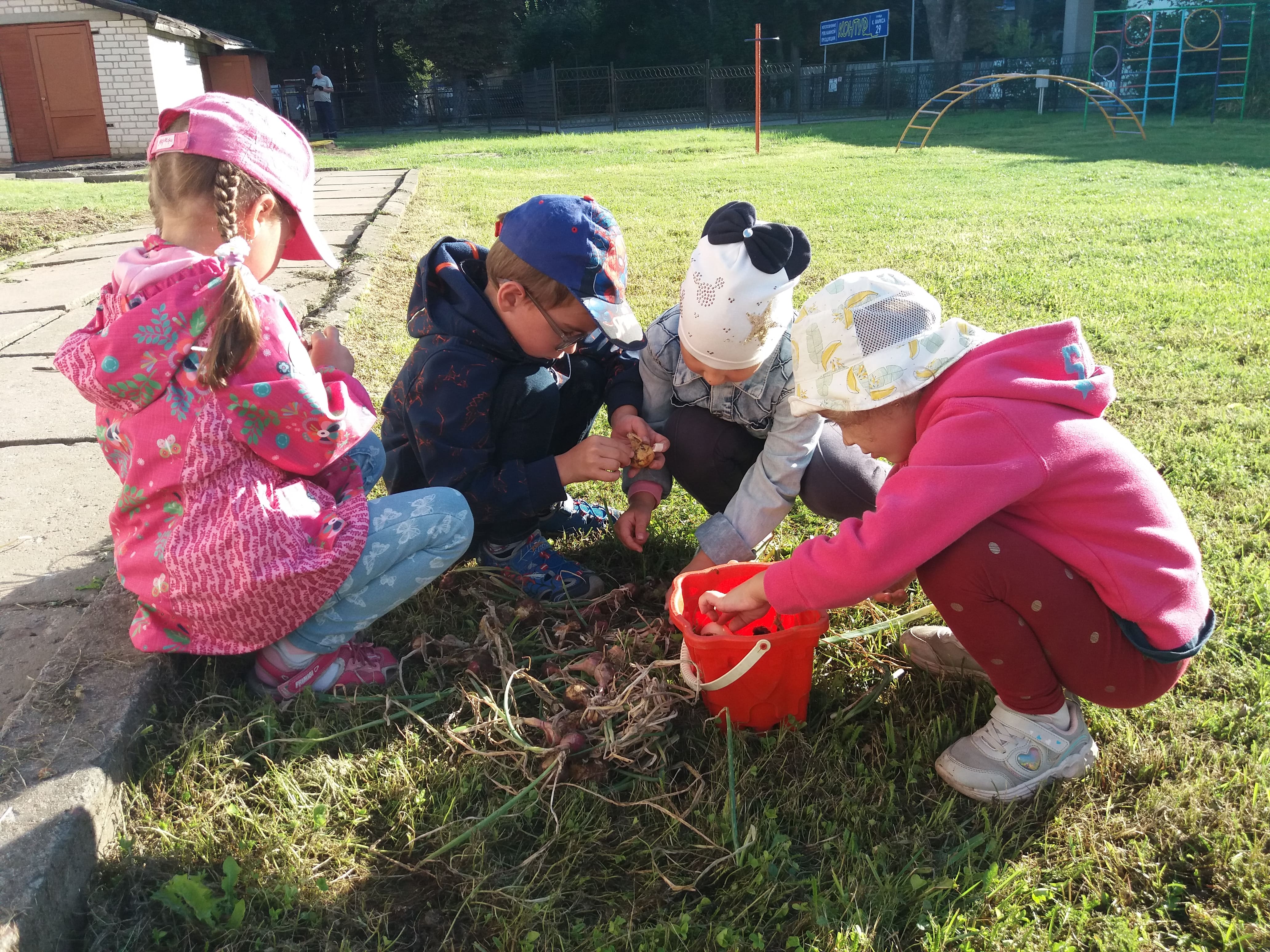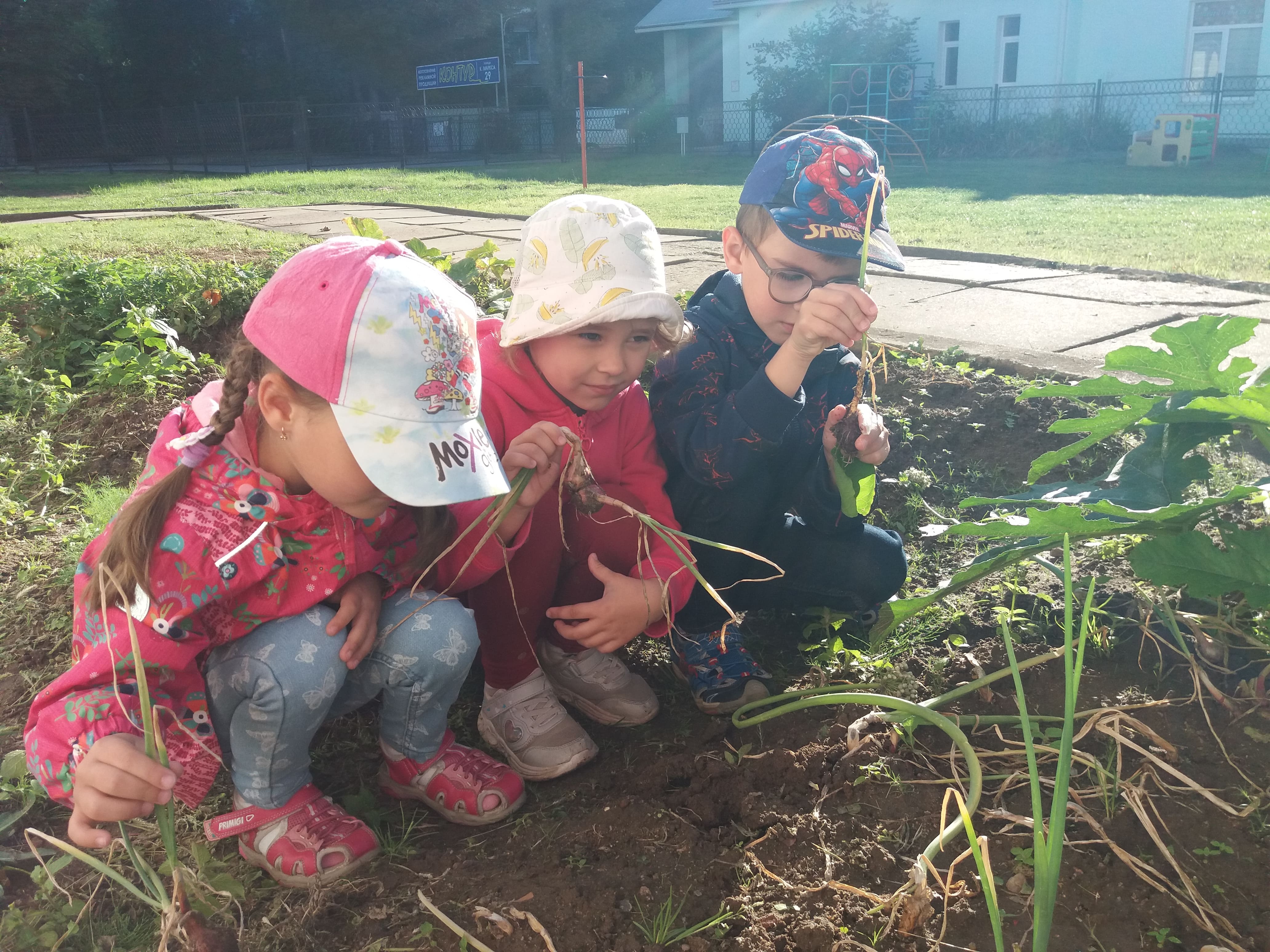 Все лето дети трудились на огороде. Сначалf сделали посадки различных культур: лук, укроп, кабачки, салат. Затем ухаживали за своими посадками: регулярно поливали их, удаляли сорняки, рыхлили почву. И вот пришла пора собирать урожай!. Ребята дружно выбирали лук и удаляли засохшие хвостики, трудились на огороде с удовольствием и очень радовались выращенному и собранному урожаю.